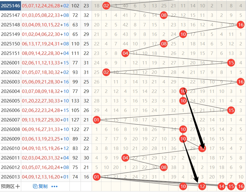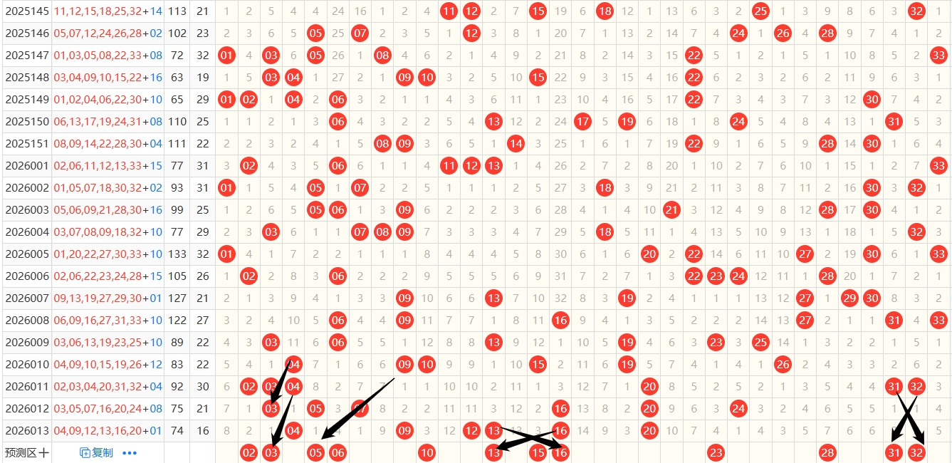 回顾上期26013期开奖04 09 12 13 16 20+ 01 ,其中一小区01-11出2个,二小区12-22出4个号,三小区23-33出0个!