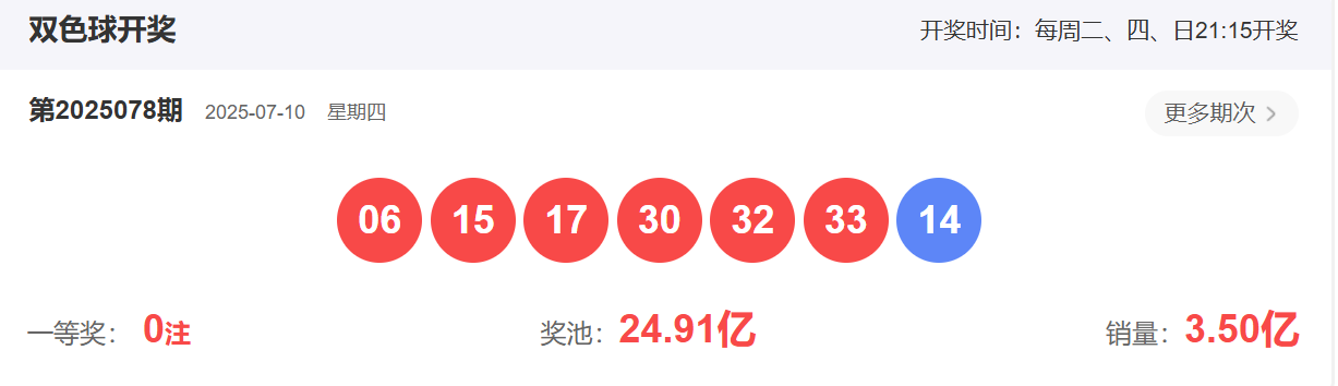 一、上一期开奖情况:福彩双色球上一期开奖号码为:06-15-17-30-32-33/14,极距为26,红球三区比1:2:3,红球质合比为1:5,红球奇偶比为3:3,012路比4:0:2,上一期蓝球开出号码为14,为偶数、大数、合数、2路号码。