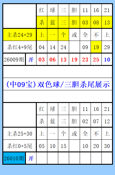 26009期:03, 06, 13, 19, 23, 25 +10。