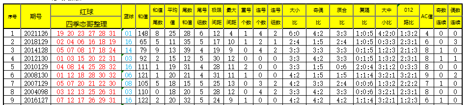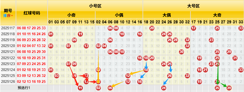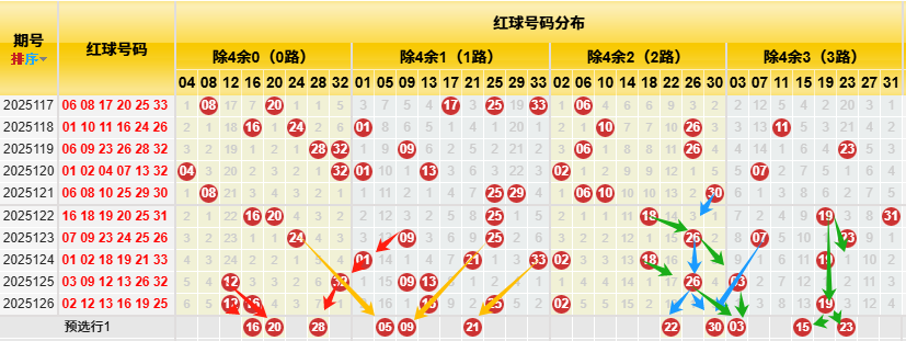 【数据参数】根据前区除4余数,组合成上图分别为余0路(简称0路)4、8、12、16、20、24、28、32);余1路(简称1路)1、5、9、13、17、21、25、29、33;余2路(简称2路)2、6、10、14、18、22、26、30;余3路(简称3路)3、7、11、15、19、23、27、31。