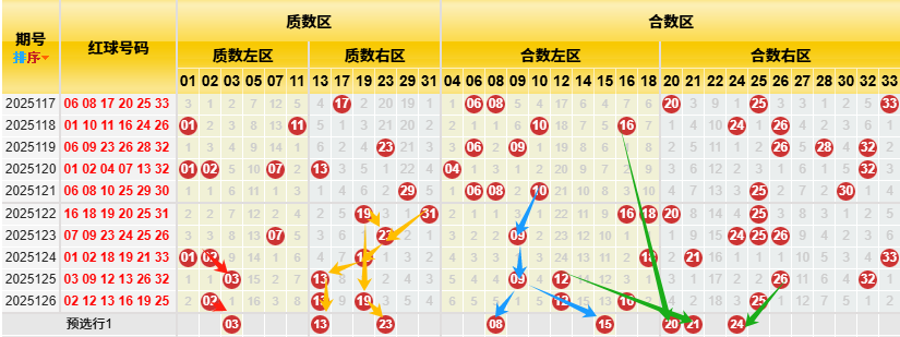 【数据参数】 根据前区质合小大属性,组合成上图质数区1、2、3、5、7、11、13、17、19、23、29、31和合数区4、6、8、9、10、12、14、15、16、18、20、21、22、24、25、26、27、28、30、32、33,质数区分为质数左区1、2、3、5、7、11和质数右区13、17、19、23、29、31;合数区分为合数左区4、6、8、9、10、12、14、15、16、18)和合数右区20、21、22、24、25、26、27、28、30、32、33。