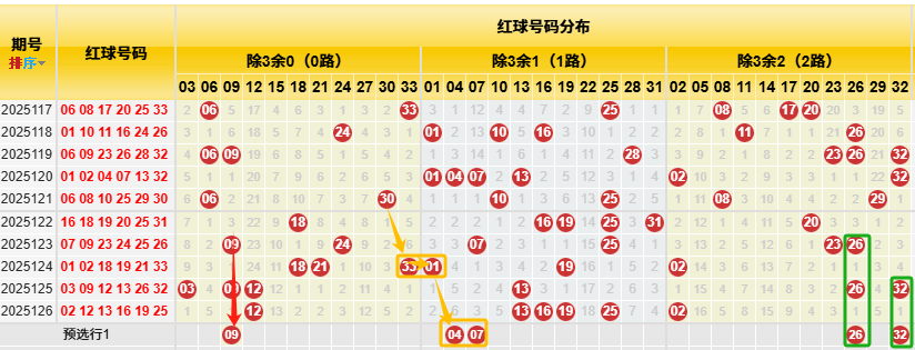 【数据参数】 根据前区除3余数,组合成上图分别为余0路(简称0路)3、6、9、12、15、18、21、24、27、30、33;余1路(简称1路)1、4、7、10、13、16、19、22、25、28、31; 余2路(简称2路)2、5、8、11、14、17、20、23、26、29、32。