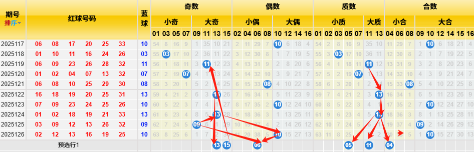 根据蓝球近十期数据统计:小奇数出现2次,大奇数出现4次,小偶数出现1次,大偶数出现2次,小质数出现2次,大质数出现3次,小合数出现1次,大合数出现4次。从上述数据可以看出偶回补到位后,今日要注意奇数咯;再来看历史数据统计,小奇数出现850次,大奇数出现852次,小偶数出现806次,大偶数出现754次,小质数出现820次,大质数出现414次,小合数出现609次,大合数出现892次,从上述数据可以看出小奇数、大偶数、小质数、小合数历史数据占优,上期命中合数和偶数,结合近十期数据对比,本期可能要出现质数回补的局面,故本期结合上述数据并根据斜率对称原理看好13 15 08 05 11 04