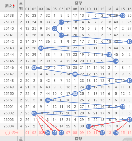 根据走势图近10期的走势看,蓝球在151期开出04蓝球之后,1大1小2大,再看下近10期的蓝球热码有回补的趋势,这种趋势规律本期判断极有可能开出小号,本期防蓝球15大号,蓝球本期重点关注04,05,06,12,14