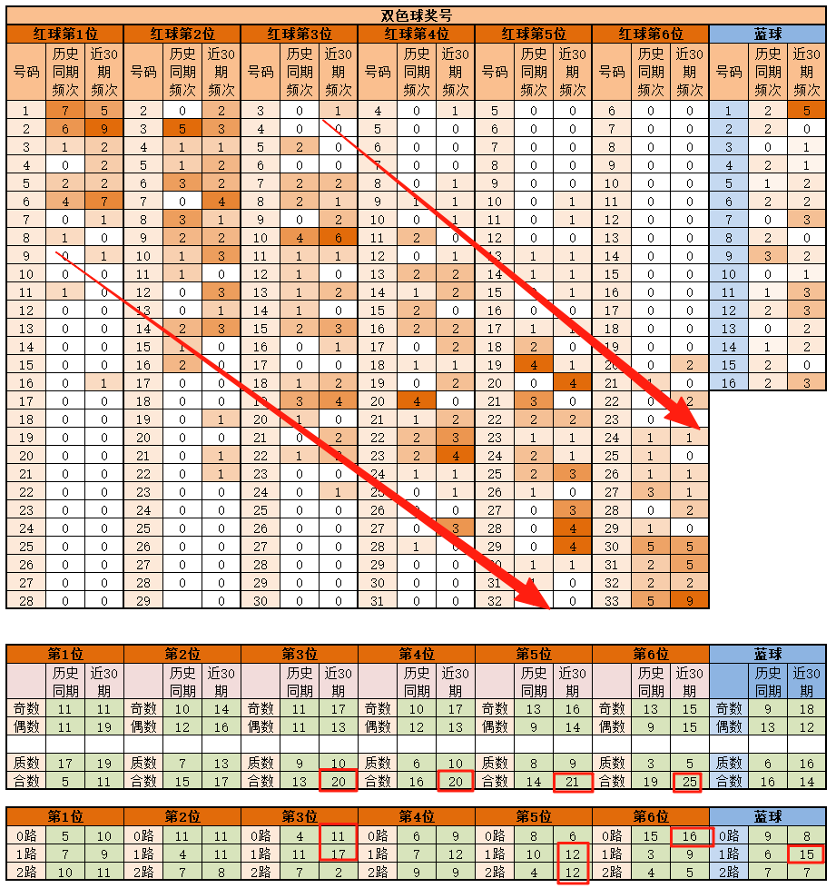 第6位,基本在21-33之间,历史同期频次最多的为33;近30期,频次最多的为33,明显特征是合数和0路优势;推荐重点30-31-33。