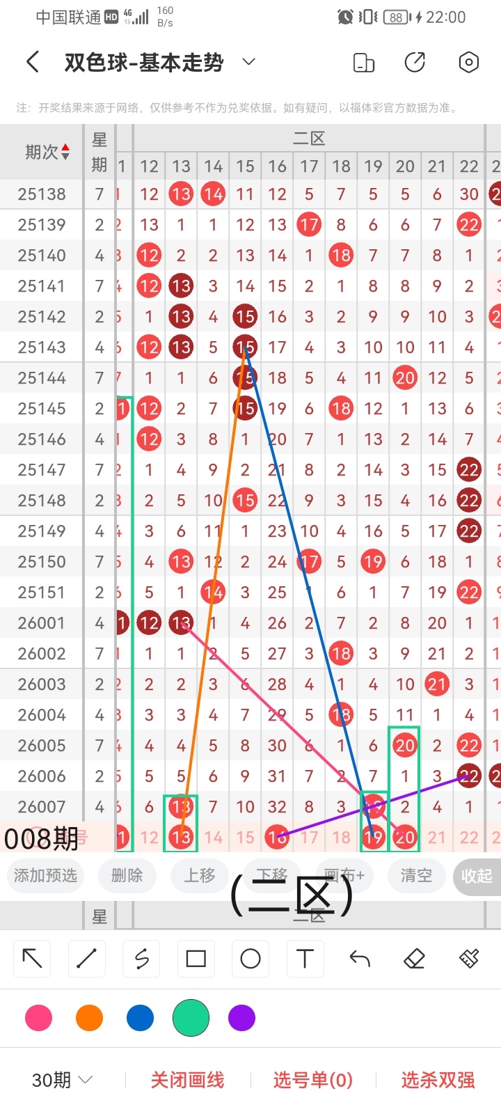 小梁结合上面图中画线思路的论证,最后给大家汇总提供一下本期红球、蓝球数据,供大家参考: