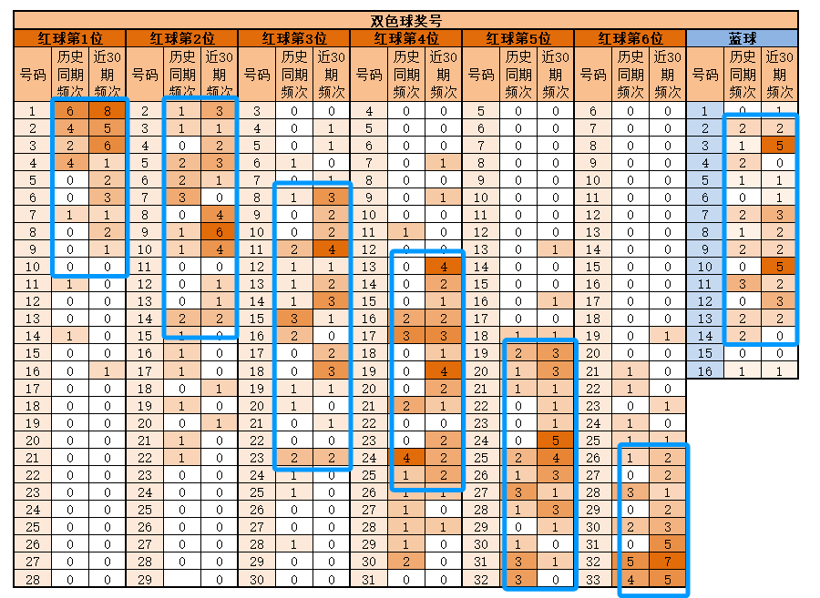 蓝球,历史同期频次最多的为11;近30期,频次最多的为3-10,明显特征是01路优势;推荐重点3-7-8-9-10-12-13。