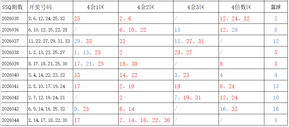 分享第一个数据分析:四分区统计数据。相对于传统的三分区,个人习惯使用四分区,就是把33个红球号码除以4,所得的余数分区如下: