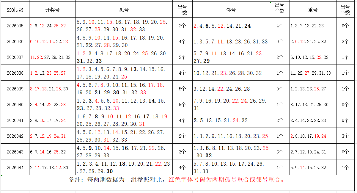 如图,以近两期数据为一组,进行对比分析。相同的孤号、邻号,可能在下期出1-4个左右。上期开出孤号4个,邻号1个,重号1个。本期参考孤号:4.5.6.7.8.9.10.11.12.20.24.25.26.27.28.32.33;邻号:1.3.13.15.16.19.21.23.29.31;孤、邻号重合号码精选:***(会员专区可见)。个人分析,仅供参考。