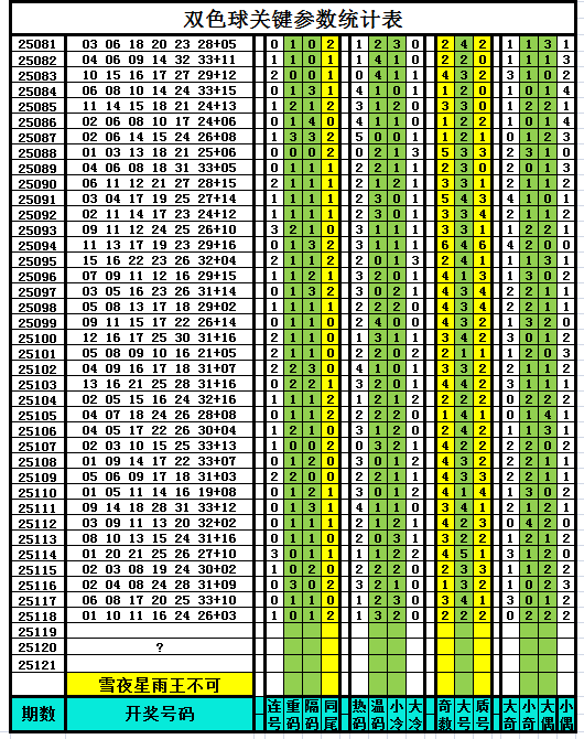 以下是作者手工统计的双色球关键参数统计表,对喜欢参数分析、过滤缩水、选号胆杀的技术性双色球爱好者有所帮助,其它读者可略过不看。
