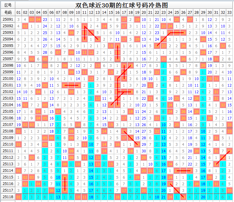 双色球119期冷热号码及出号趋势分析(具体号码可参见上图或会员文章的觅宝图):