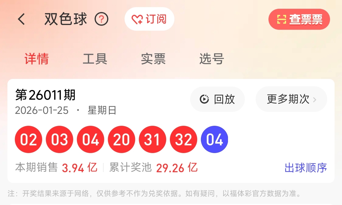 首先让我们回顾一下上期双色球26011期的开奖号码为 02、03、04、20、31、32,蓝球04。和值92,跨度30,区间比为3:1:2,奇偶比为2:4。