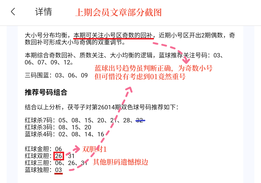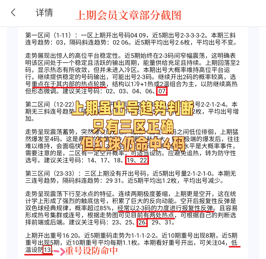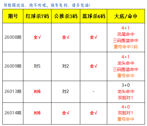 上期红球杀7码对6,公推杀3码全对,蓝球杀号全对。会员文章中双胆对1,重号命中。红球命中4码,本期再接再厉!