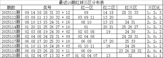 一区上期走热,开出4个红球,近10期开出24个红球,表现非常活跃,本期预计走温,开出1-2个红球,参考号码09;二区上期走温,开出1个红球,近10期共开出13个红球,走势相对较冷,本期预计继续温冷,在2个以内出号,注意号码15、16;三区上期走温,开出1个红球,近10期共开出23个红球,出号比例相对较高,本期看好再次热出,关注3个红球,看好号码23、24、27;