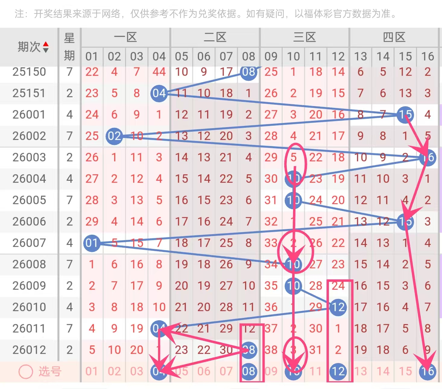08、10、12 为近5期已开蓝球,偶号延续性强,尤其10在近2期出现2次,仍有热度;