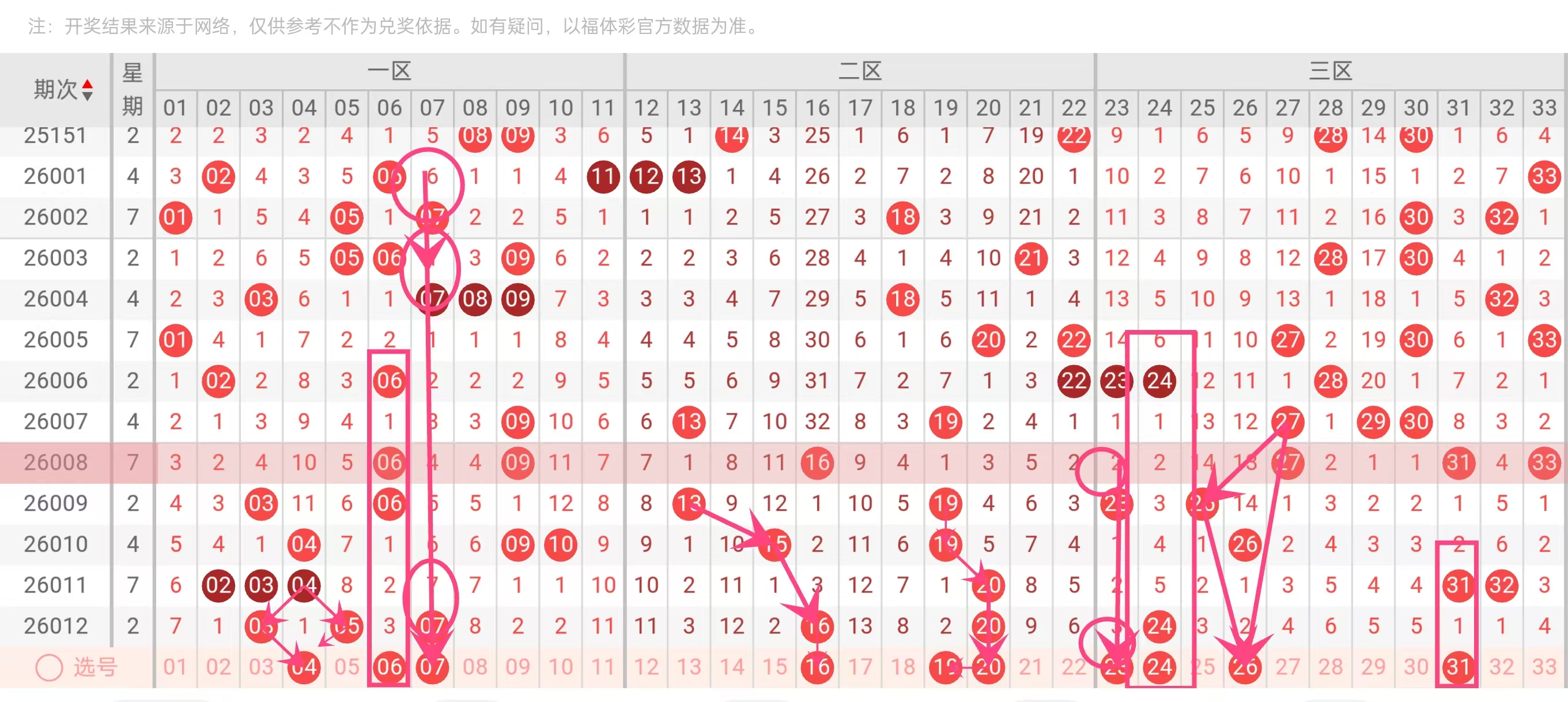 33:近10期仅出现1次,属极冷号,且近期三区大号已有31、32活跃,33继续走冷概率高。
