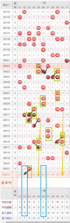 一区本期选号建议首先考虑重号03号,一区近20期一共开出了9次重号,说明一区开出重号的概率较大本期有可能会继续重号可以考虑开出重号,并且开出重号时基本都要连出重号。其次考虑遗漏期数较大的号,02号达到了最大遗漏期数同时也是上一期开出的03号的邻号,06号遗漏了12期是目前一区遗漏期数最大的号,都可以防冷号开出。最后考虑10号,10号上一次开出间隔4期,若本期开出将形成4-5的形态规律可以考虑开出。05号同理。