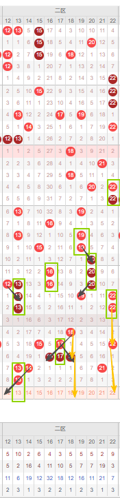 二区本期首先看好18号,上次开出18号间隔一期,本次若开出将形成1-2的形态规律。其次看好22号,上次开出22时间隔了2期,本期如果开出将形成2-3的形态规律。由图可见近二十期二区重号出现了10次说明近期开出重号的概率较大,三重号也出现了两次上一次13号也是开出了三重号,因此本次继续看好13号有开出重号的可能。最后考虑邻号12号,本期若是开出12号与前两期开出的14号、13号连续形成邻号可以考虑。