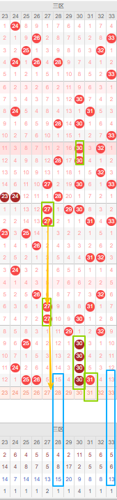 在近20期内开出了6次重号,上一期的30号已经连续开出了四重号,已经是三区出现的重号连续期数最高的了,那么本期的重号看好31号,是重号的同时也是30号的邻号。其次,23号、28号、33号三个号码的遗漏期数均有12期以上,且都已经达到其本身的最大遗漏期数,可以考虑防冷号开出。还可以考虑隔断号比如27号,上一次开出间隔了有六期,如本期开出则会形成6-5的形态规律。