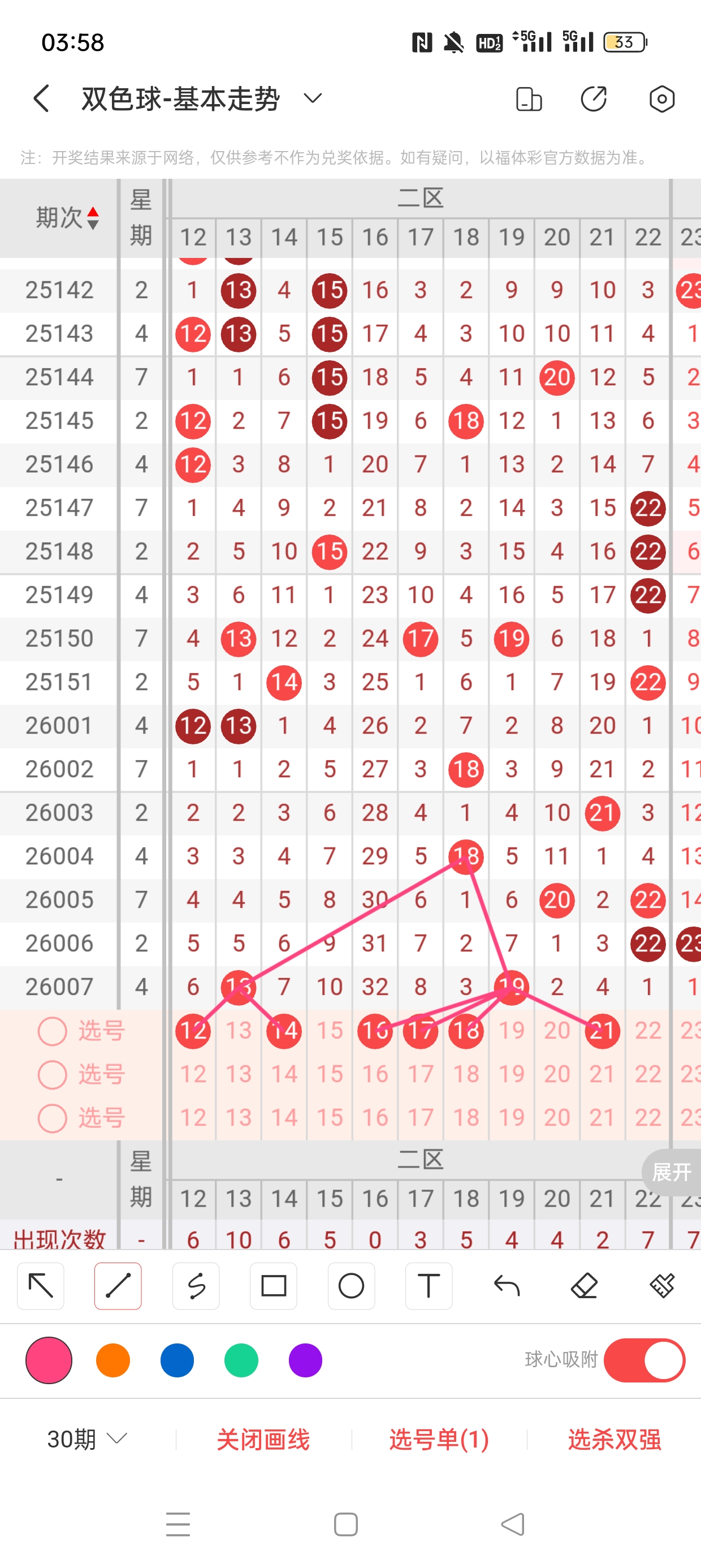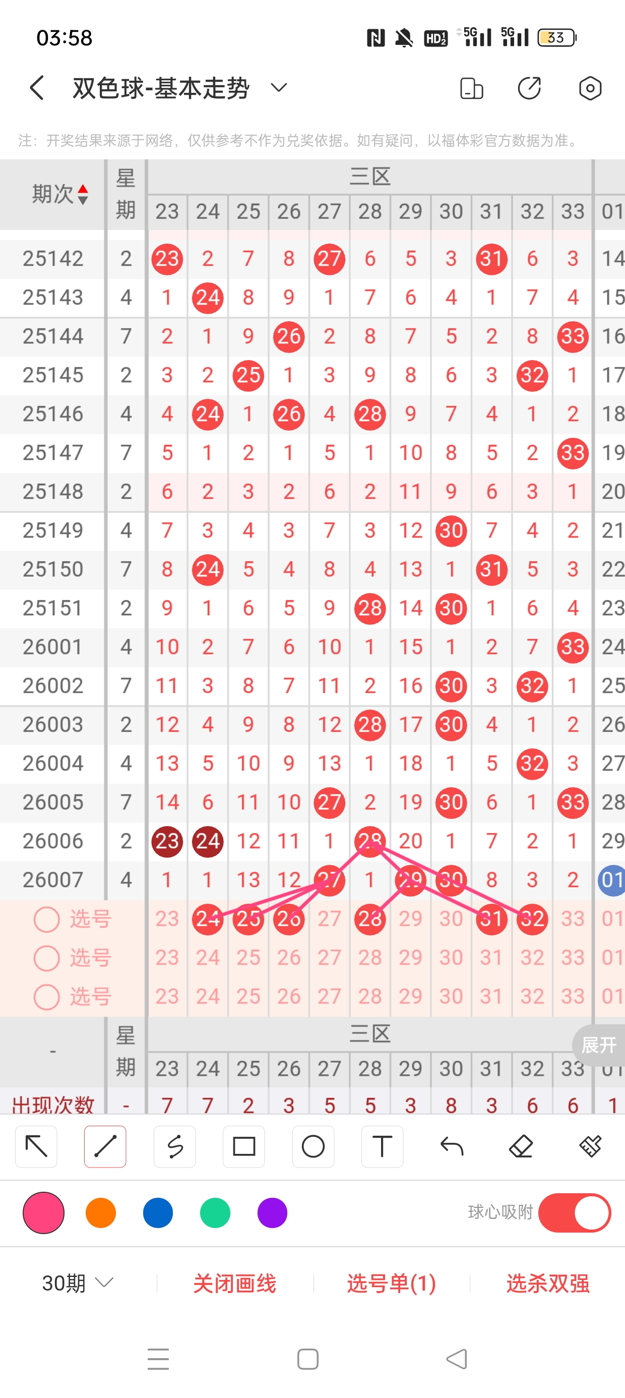 三区(23-33)近12期本区邻孤传6邻6孤0传,孤号热度高,本期着重邻传。近12期本区012路7:0:5,0/2路热度高,本着重1路。24、25、26分别遗漏1期、13期、12期,三者与27之间呈现向左遗漏递减态势,需防。28已遗漏1期,与29之间呈现向左遗漏递减态势,需防。31、32分别遗漏8期、3期,两者与29、30之间呈现向右遗漏递减态势,需防。
