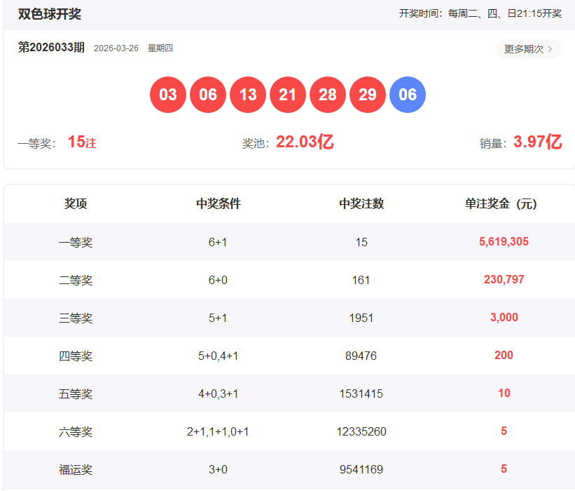 双色球上期开奖结果:03.06.13.21.28.29+06