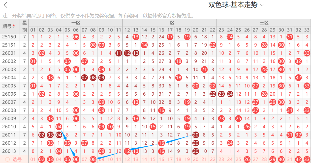 龙头凤尾:本期的龙头继续关注二路号,比如这个8,上期的胆码12就是四斜连号,那么本期会不会继续结论出8呢,当然,上期看12不是这一个依据,专属直播间给大家详细讲解了,其次考虑2.5,那么如果不看二路龙头的,则考虑0路3.6.9,这里主看3.6,比如这个6是斜连号,二区看有6尾的,所以龙头的范围就在上面这些号码里面,凤尾上期看二路稳稳当当,可惜没看断三区,本期考虑继续二路,即26.29.32,如果不看二路则考虑0路,比如30或者33,本期是比较看好三区强势回补的,所以大家三区这里可以好好仔细的看看。