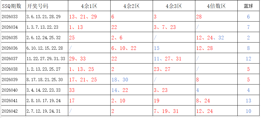 分享第一个数据分析:四分区统计数据。相对于传统的三分区,个人习惯使用四分区,就是把33个红球号码除以4,所得的余数分区如下: