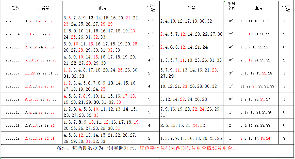 如图,以近两期数据为一组,进行对比分析。相同的孤号、邻号,可能在下期出1-4个左右。上期开出孤号2个,邻号1个,重号3个。本期参考孤号:4.5.9.10.14.15.16.17.21.22.26.27.28.29.33;邻号:1.3.6.8.11.13.18.20.23.25.30..32;孤、邻号重合号码精选:***(会员专区可见)。个人分析,仅供参考。