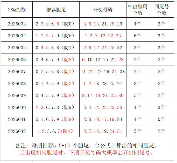 如图,每期推荐胆尾中出1-4个。上期推荐胆尾中出4尾5码!推荐胆尾是按照公式计算的顺序,不定位红球号码的顺序。本期推荐胆尾:6尾/7尾/8尾/4尾/9尾  。加推重点胆尾:***(会员专区可见)。推荐胆码号码:***(会员专区可见)。个人分析,仅供参考。