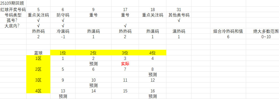 公式:【重号0~2个+重点关注码1~5个+防守码(备选)0~4个+其他类号码0~3个】,孤号2~4个,也是经过了两百多期的验证,通用率95%以上,可以和上面的组合冷温热码范围配合着选,如果有号码属于两种类型,那两个类型号码都计数一次