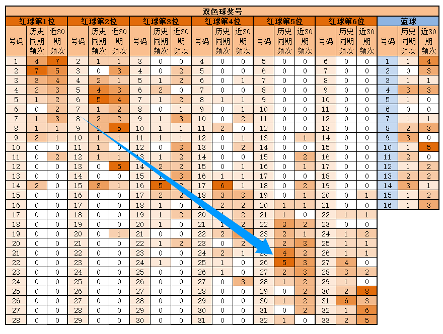 第5位,基本在16-31之间,历史同期频次最多的为26;近30期,频次最多的为24-26-27,明显特征是合数优势;推荐重点24、25、26、27、28、30、31。
