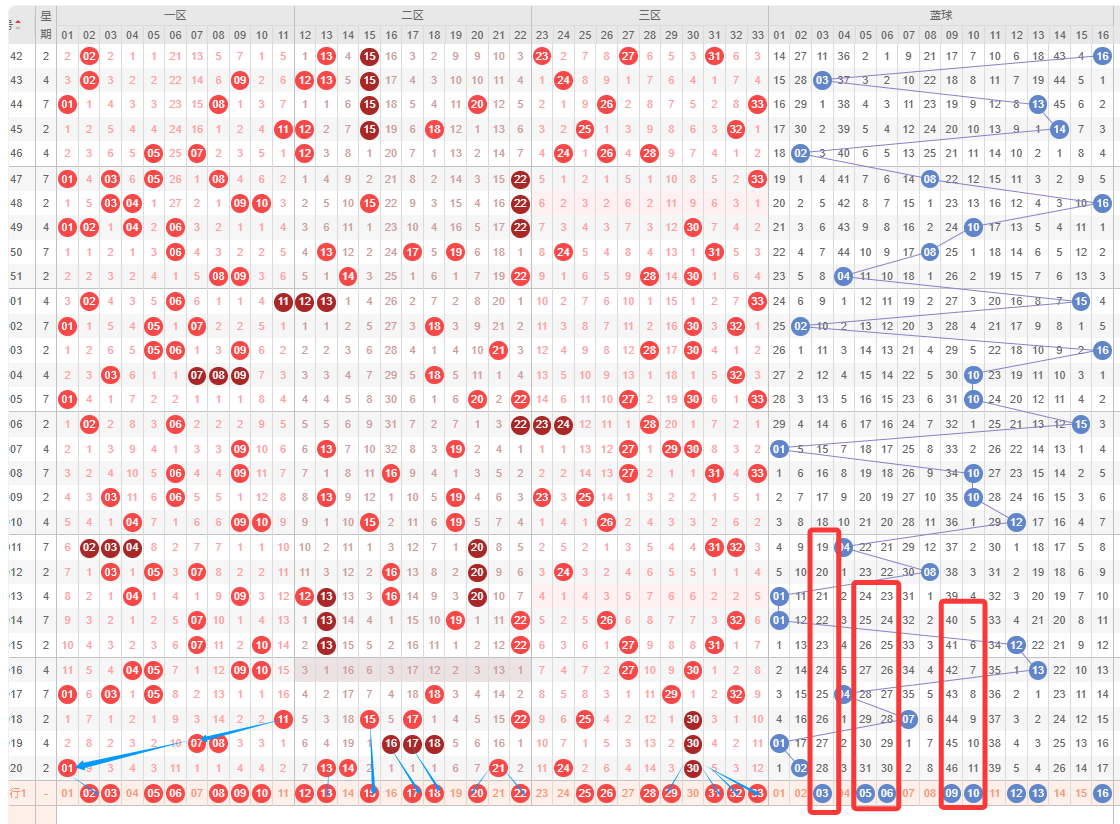 红球三区,上期开出了2码,温度上升,本期看好0~3码;从凤尾走势看,连续3期开了30,本期比较看好凤尾往右路开,其次是防左路号码;