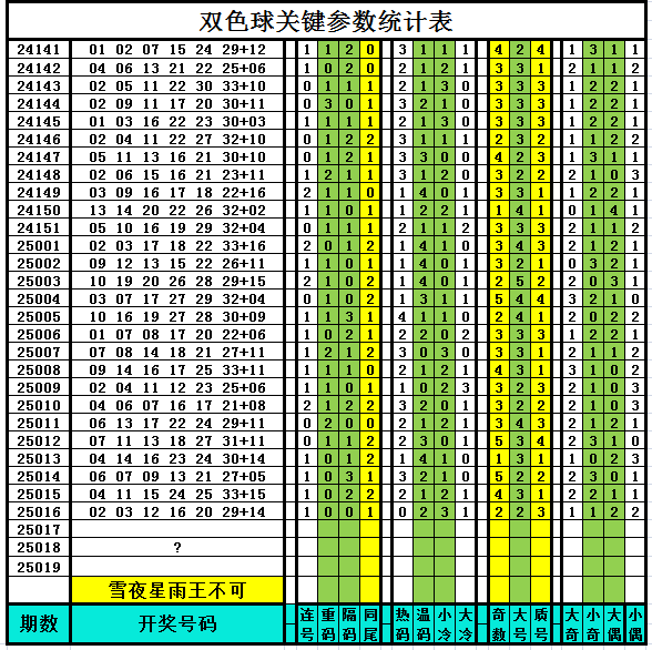 以下是作者手工统计的双色球关键参数统计表,对喜欢参数分析、过滤缩水、选号胆杀的技术性双色球爱好者有所帮助,其它读者可略过不看。