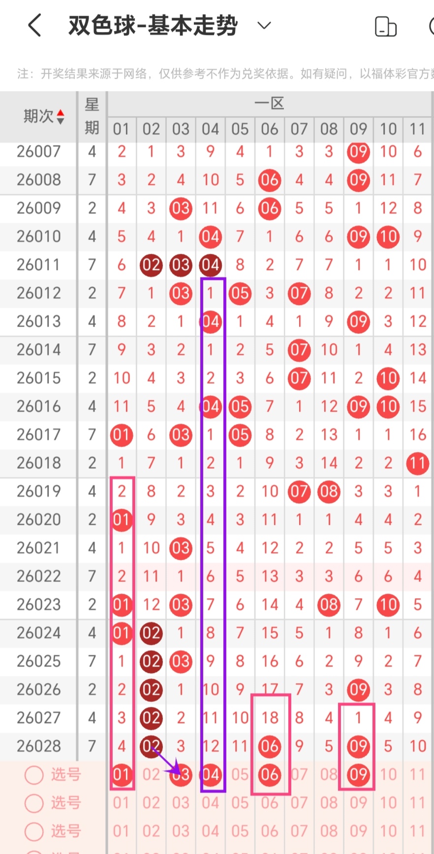通过对同星期周二重号出现数量规律进行统计分析,本期考虑出号0-1个,即02-09-16-22-25-29出号0-1个