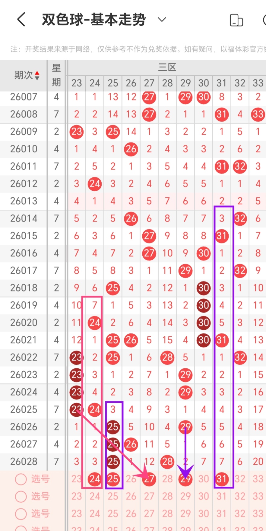 通过对同期次重号出现的数量规律进行统计分析,本期考虑出号0-1个,即05-15-16-25-30-33出号0-1个