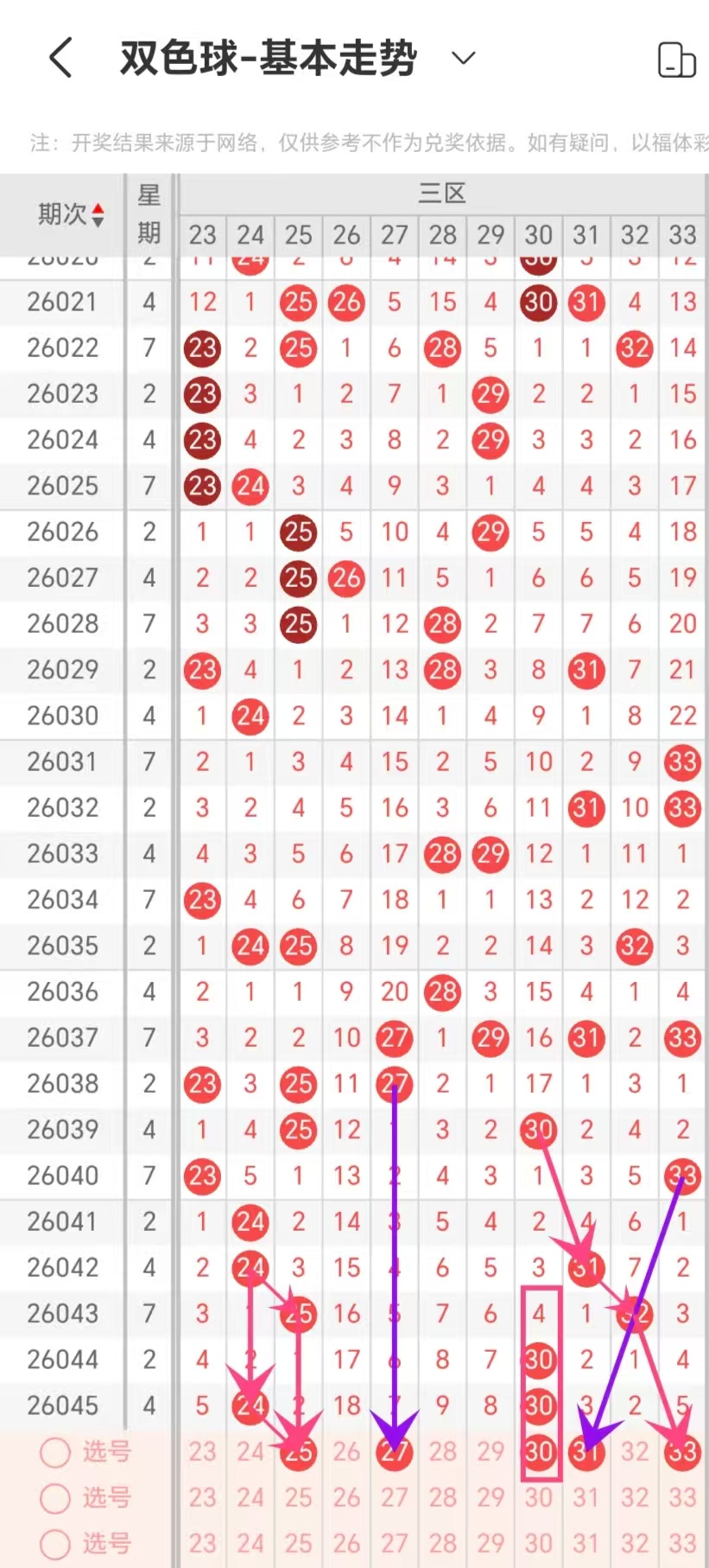 通过对同日期重号出现的数量规律进行统计分析,本期考虑出号0-2个,即02-11-24-25-27-30出号0-2个