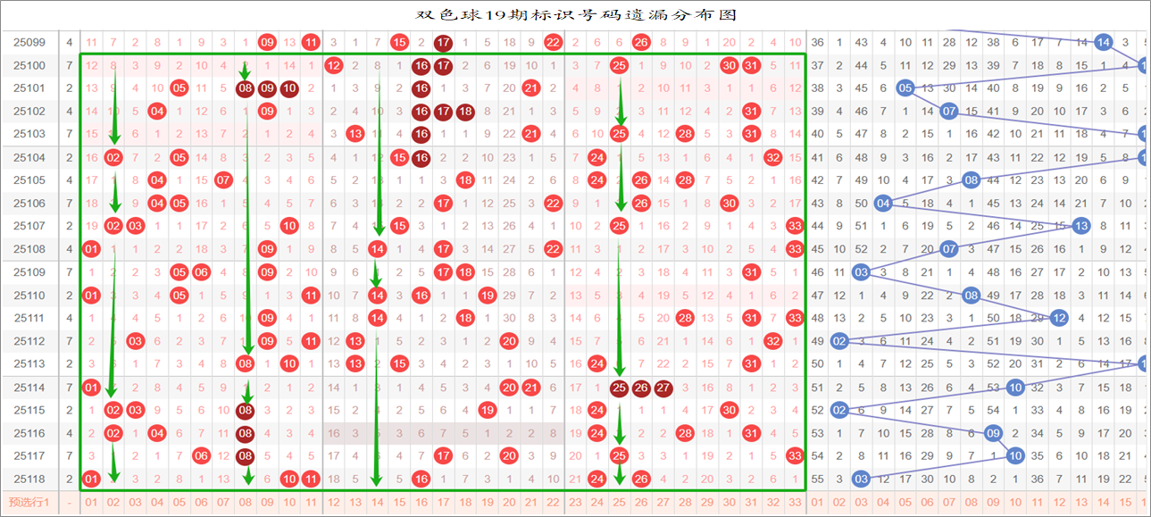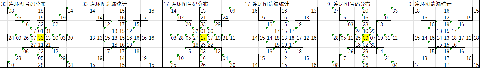 由于数据量大,不一一统计,下图为各个号码分别在33、17、9连环图上的遗漏统计汇总图:
