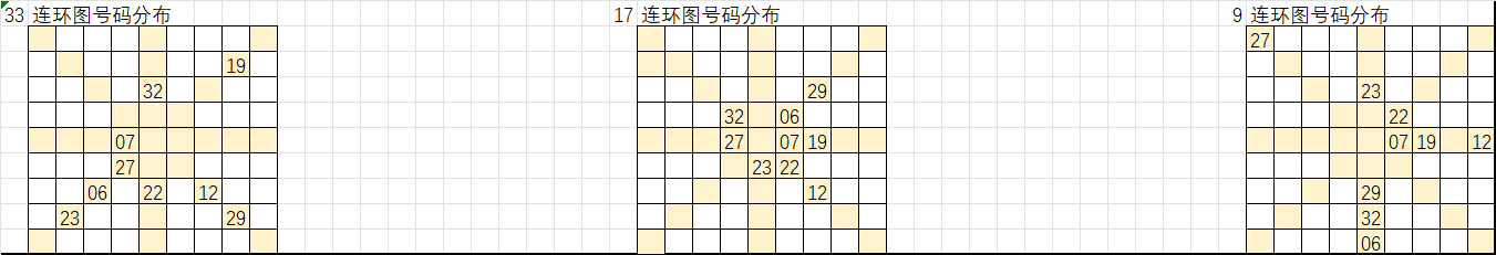 以上是33、17、9的连环图,可以在一起彩平台的九转连环图中查看历期号码分布,以当前期数来看,历史同期共有19期(2003-2023),那么我们就以19期号码来进行遗漏统计,然后把每个号码在近19期的遗漏总数统计出来,分别带入33、17、9的连环图,取出遗漏值大于16的号码,把这些号码在“环上”和“轴上”的相邻号码取出来进行统计,选取出次前15的号码作为大底。