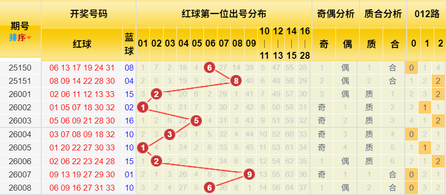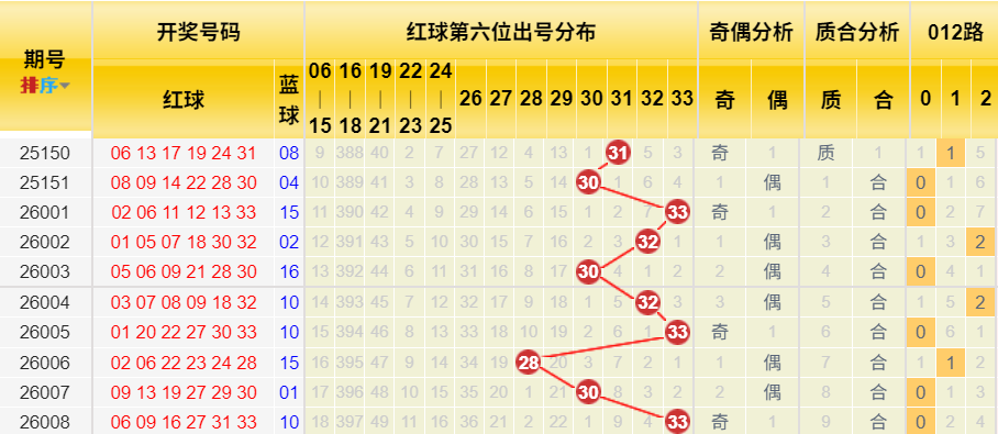 2026008期开奖号码为:06 09 16 27 31 33 + 10。 红球和值122(和尾2),跨度27,奇偶比4:2,大小比4:2,呈现典型的大小两极分化格局。蓝球开出1路偶数10。上期和值居高不下,且大号持续强势,本期调整压力进一步累积。