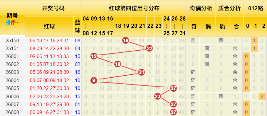 这是另一核心规律点。历史同期数据显示,第四位号码8次落在15-23区间。近几期开奖(22, 19, 21, 27)虽有波动,但核心区间未变。上期27略高,本期强烈看好回归15-23核心区间,胆码级关注19、22。