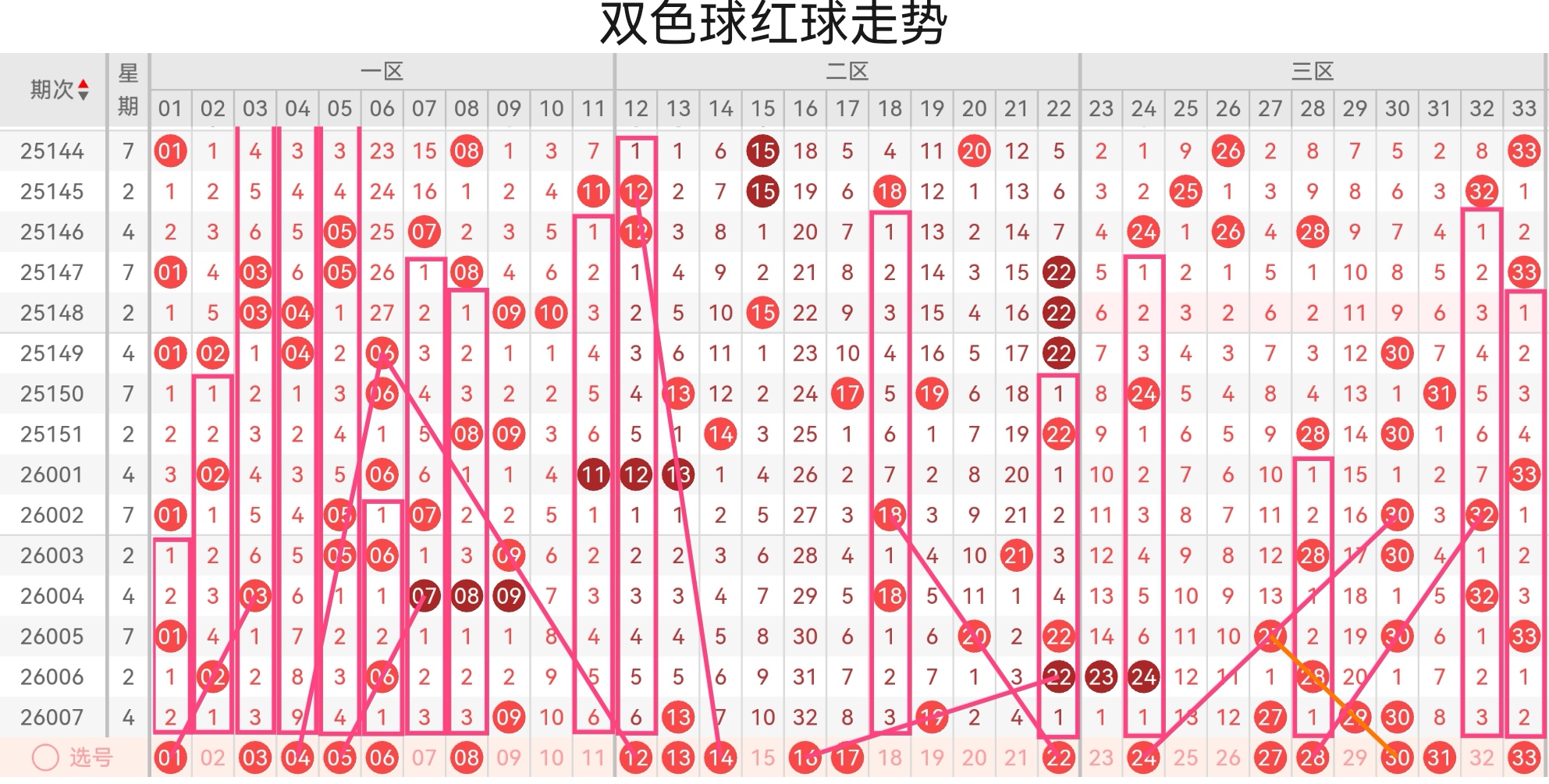 双色球第26008期基本走势分析如下: