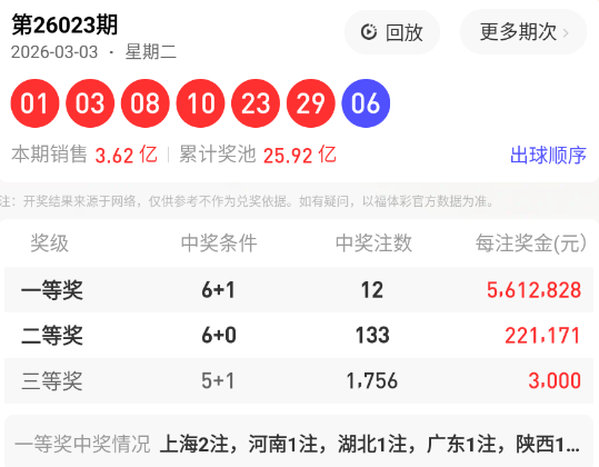 上期回顾:双色球023期开出红球号码为: