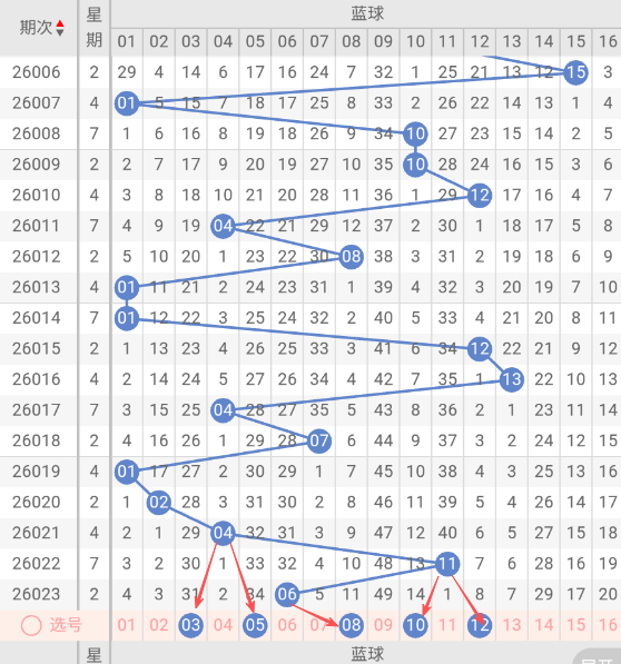 根据走势图近10期的走势看,蓝球在14期开出01蓝球之后,2大5小1大1小,再看下近10期的蓝球冷码有回补的趋势,这种趋势规律本期判断极有可能开大号,本期防蓝球08小号,蓝球本期重点关注03,05,10,12