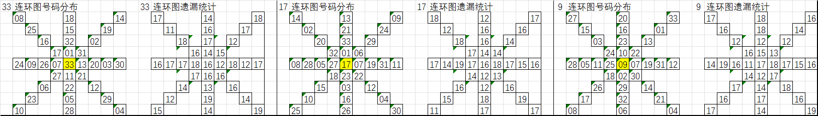 由于数据量大,不一一统计,下图为各个号码分别在33、17、9连环图上的遗漏统计汇总图: