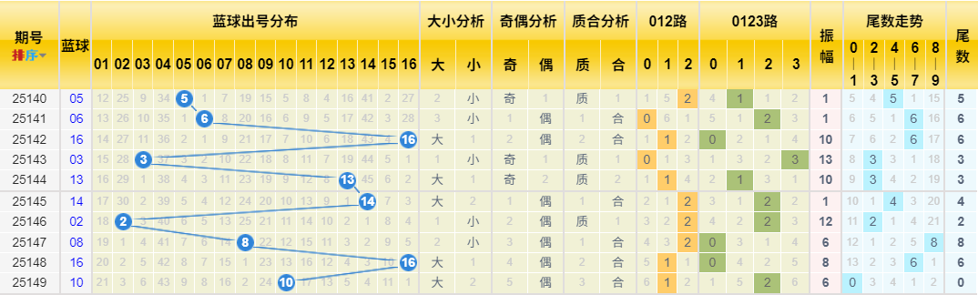蓝球012路:0路(11次),1路(11次),2路(8次)。近10期0路(3次)相对较冷。