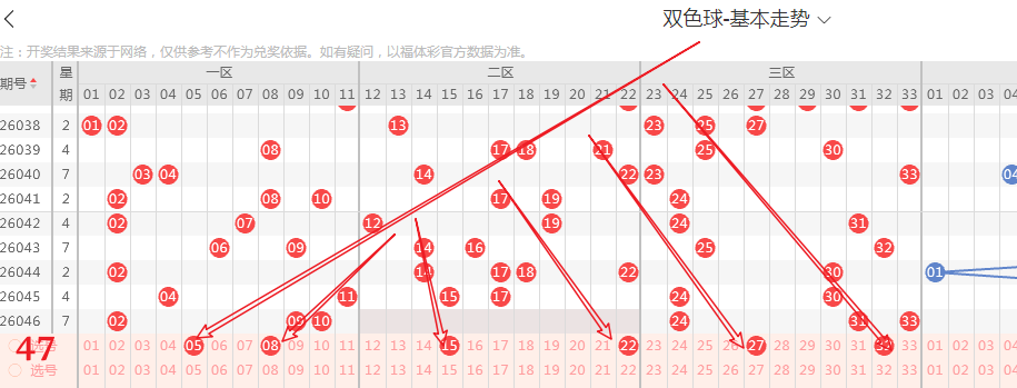 8区间断层法:将红球分为01-11、12-22、23-33三区,找出近期出号最少之“断层”区间,以上期该区间最大号减3为该区核心胆码。