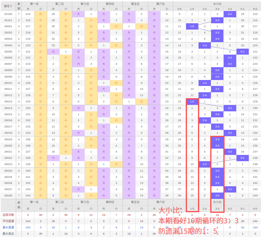 上期大小比:3:3,近10期大小比出现情况:3:3、3:3、4:2、5:1、2:4、3:3、3:3、3:3、4:2、3:3,最近10期出现6期3:3,出现2期4:2,出1期2:4,出现1期5:1,出现0期1:5,出现0期6:0,出现0期0:6,根据近10期规律本期看好隔期开出3:3,防10期循环的4:2,综上所述推荐大小比推荐:1:5,重点关注:3:3。