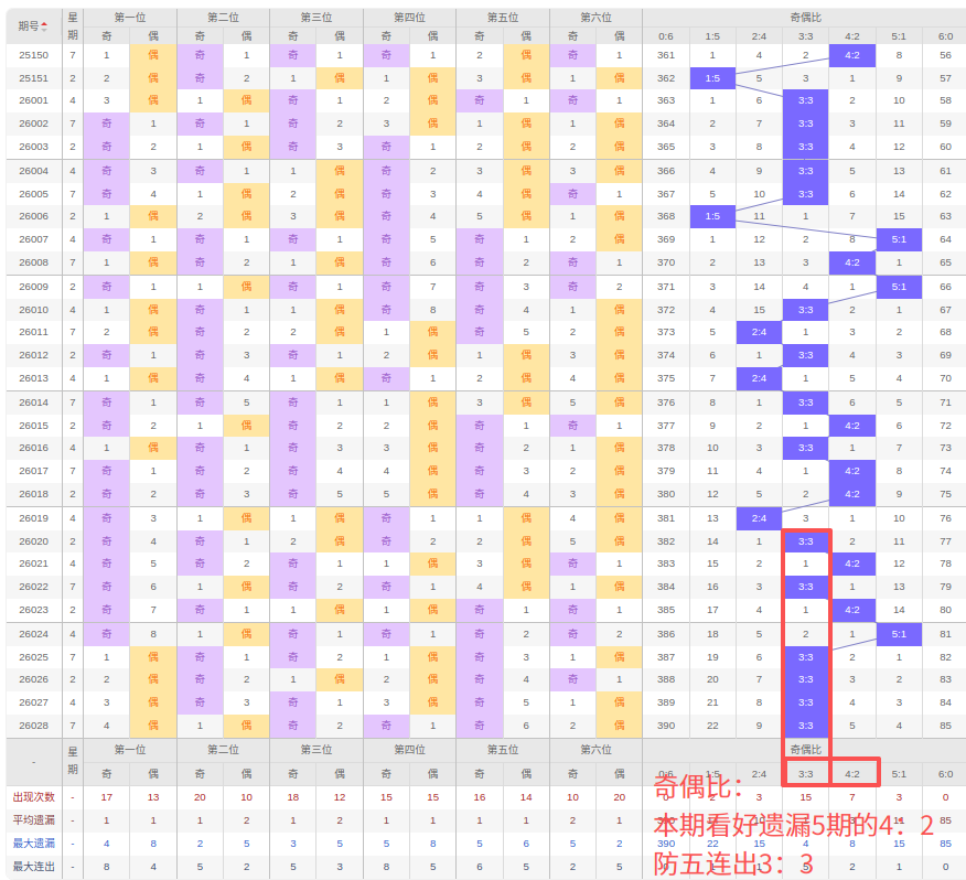 上期奇偶比:3:3,近10期奇偶比出现情况:2:4、3:3、4:2、3:3、4:2、5:1、3:3、3:3、3:3、3:3,最近10期出现6期3:3,出现2期4:2,出现1期2:4,出现1期5:1,出现0期1:5,出现0期6:0,出现0期0:6,根据近10期规律本期看好遗漏5期的4:2,防五连出3:3,综上所述推荐奇偶比推荐:3:3,重点关注:4:2。