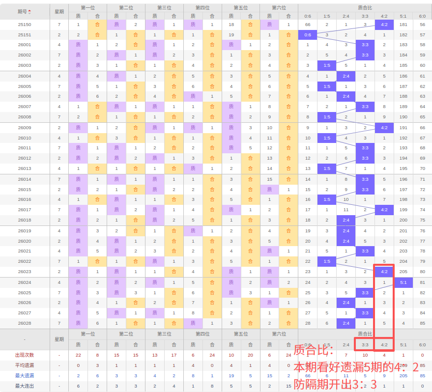 上期质合比:2:4,近10期质合比出现情况:2:4、2:4、3:3、1:5、4:2、5:1、3:3、2:4、3:3、2:4,最近10期出3期3:3,出现1期4:2,出现4期2:4,出现1期5:1,出现1期1:5,出现0期6:0,出现0期0:6,根据近10期规律本期看好遗漏5期的4:2,防隔期的3:3,综上所述推荐质合比推荐:3:3,重点关注:4:2。
