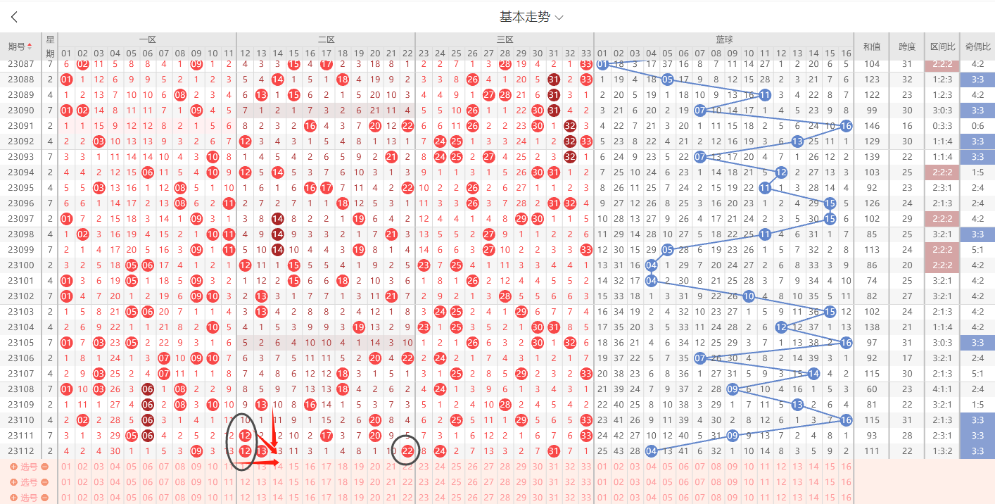 1、红球特征分析:(通过整体走势不难看出每期开奖号都具备以下明显的特征点)